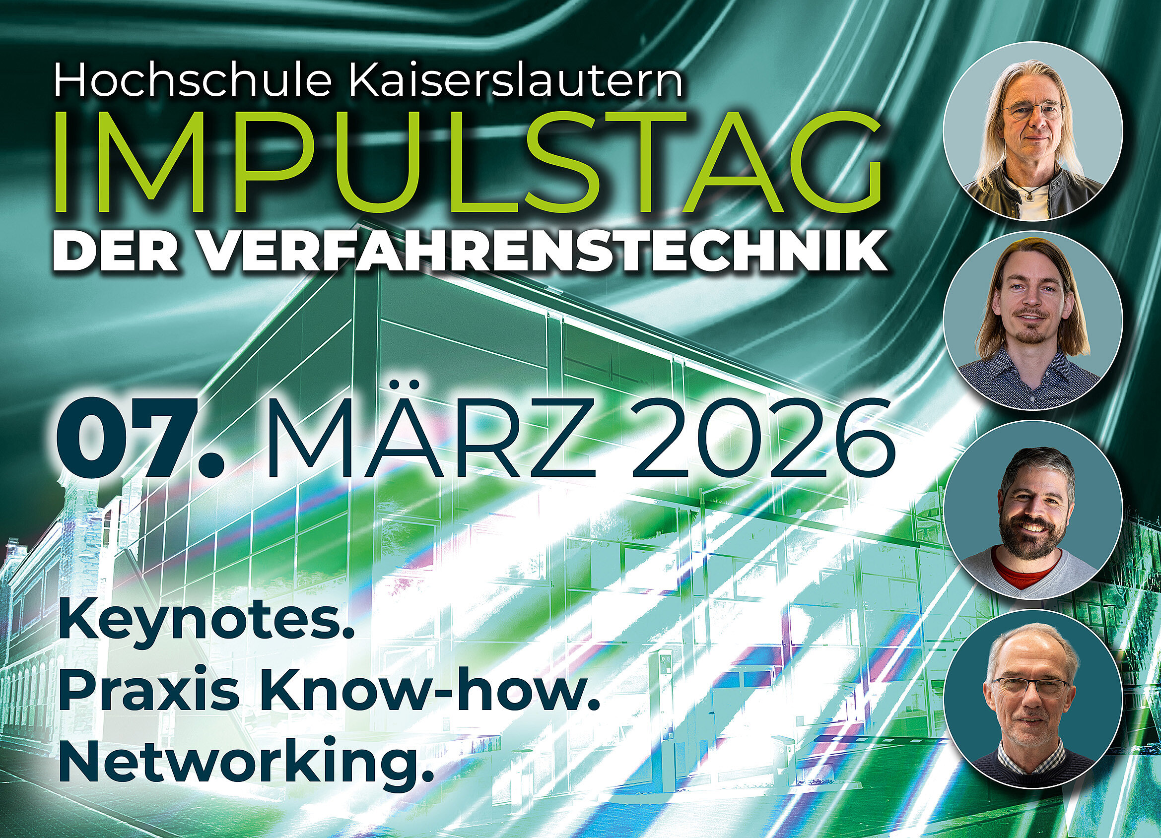 Am Samstag, 7. März 2026, findet ab 10:00 Uhr der Impulstag der Verfahrenstechnik an der Hochschule Kaiserslautern statt. Veranstaltungsort ist eines der modernsten Hochschul-Labore Europas. Die Teilnahme ist kostenlos. Die Veranstaltung wird initiiert von Professor D. Ing. Wulf Kaiser, Studiengangsleiter berufsbegleitender Master Prozesstechnik und Duale Studiengänge Angewandte Ingenieurwissenschaften.