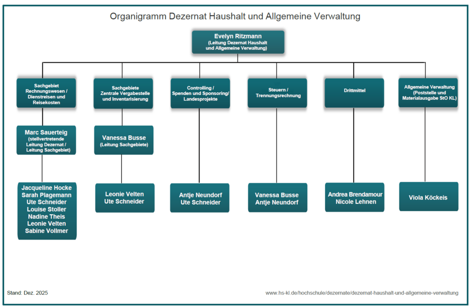 Zu den Kernaufgaben des Dezernats Haushalt und Allgemeine Verwaltung gehören die Verwaltung der Haushaltsmittel sowie die Erbringung diverser Serviceleistungen für Mitarbeitende und Studierende.