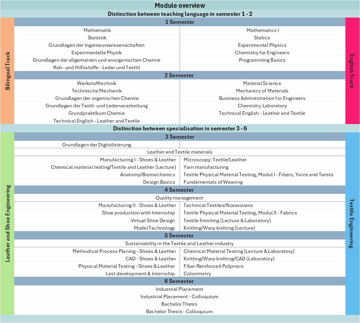 Um unseren Absolventen die besten beruflichen Perspektiven zu ermöglichen, bieten wir einen neuartigen Studiengang an. In diesem werden die Natur- und Ingenieurwissenschaften sowie die Grundlagen der Schuh-, Leder- und Textilindustrie in den ersten zwei Semestern auf Deutsch unterrichtet. Die spezifischen Fachmodule beider Schwerpunkte werden dagegen auf Englisch angeboten, um den globalen Anforderungen beider Branchen zu erfüllen.