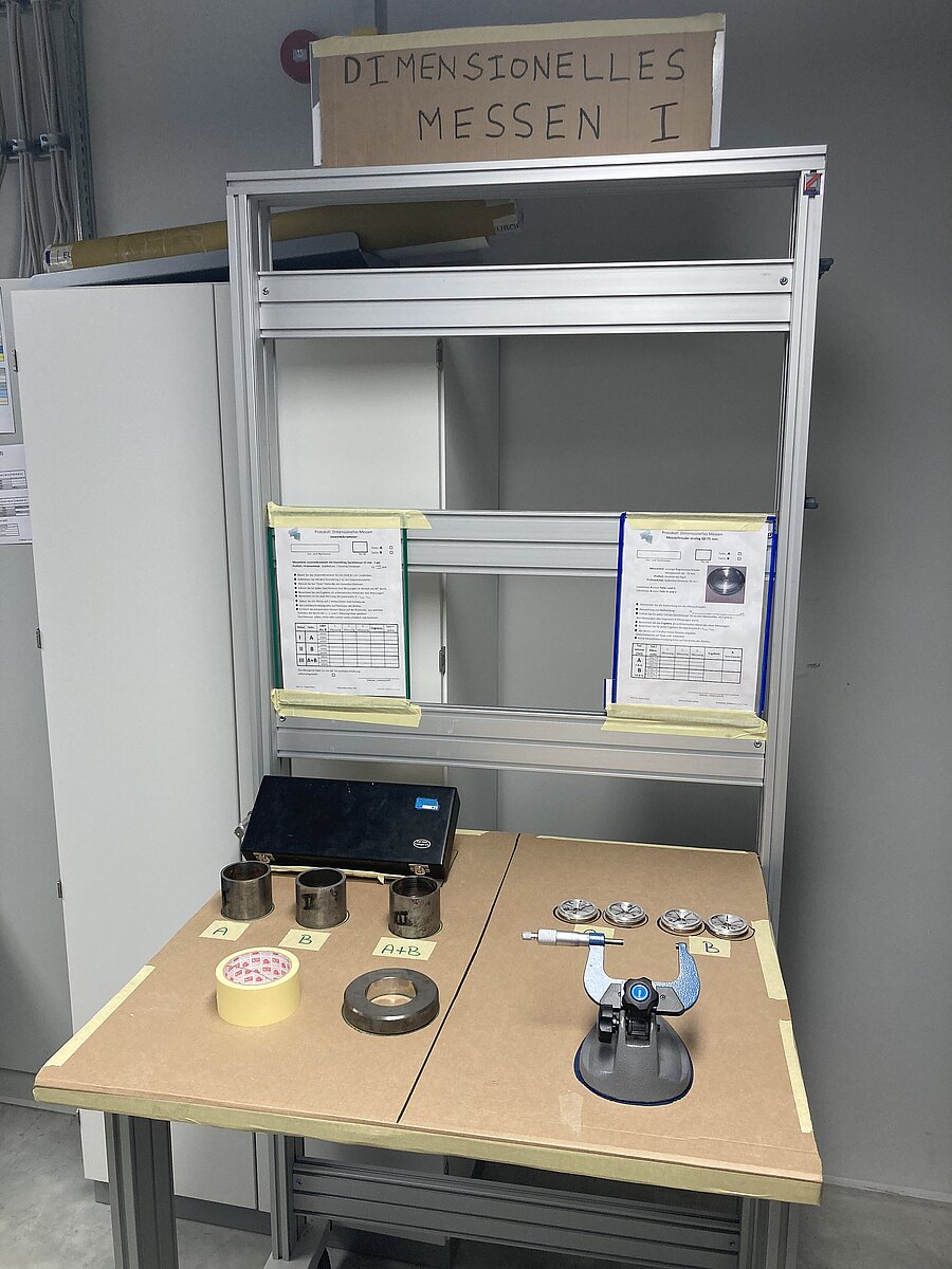 In den Laborversuchen zum dimensionellen Messen werden mit einfachen Handmessmitteln geometrische Längenmaße an unterschiedlichen Werkstücken überprüft. Im Einsatz sind dabei u.a.: analoge Messschieber mit Nonius, analoge und digitale Bügelmessschrauben, Innenmessgeräte (Subito), Feinzeiger zur Messung von Außendurchmesser, Grenzlehrdorne, Parallelendmaße. Die Versuchsdurchführung und die einzelnen Messaufgaben werden in der Regel in entsprechenden Protokollvordrucken dokumentiert.