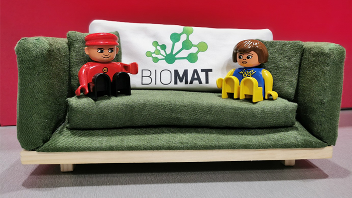 Das Messeexponat, für das sich das Team um Grishchuk entschieden hat, ist ein Miniatursofa. Entwickelt und hergestellt hat es Laura Riehm, Doktorandin im Projekt BIOMAT. Sie betreut den Messestand mit und berichtet: „Wir stellen hier auf der Messe auch ein sehr großes Interesse an unserem Master-Studiengang Angewandte Polymerchemie fest. Die Studierenden erhalten dort über die vertieften Kenntnisse zur Polymerchemie hinaus vor allem Kompetenzen in den Zukunftsthemen Biotechnologie, Nachwachsende Rohstoffe und Nachhaltigkeitsanalyse. Durch diesen Themenmix sind unsere Absolvierenden für die Industrie richtig interessant.“ Mit einer Sechs müssen sich die Studierenden hier übrigens fast nie setzen. Sowohl im Master- als auch im vorgeschalteten Bachelor-Studiengang Angewandte Chemie sind die Studierenden meistens sehr erfolgreich. Dies ermöglichen vor allem die praxisnahe Lehre und das sehr gute Betreuungsverhältnis an dem familiären Campus.