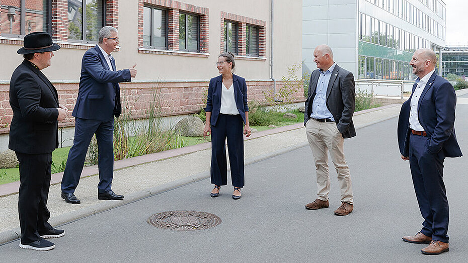 The university management (from left to right) will be happy to answer your questions and listen to your suggestions: Prof. Klaus Knopper (Vice President for Digitization), Prof. Dr. Hans-Joachim Schmidt (President), Kathrin Kilian (Chancellor), Prof. Dr. Karl-Herbert Schäfer (Vice President for Research and Transfer), and Prof. Dr. Michael Magin (Vice President for Internationalization) (Photo: Alexandra Lechner)