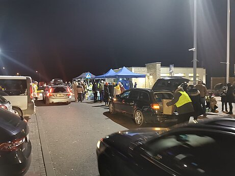Wieder auf der Schnellstraße hielt die Gruppe an einem Rastplatz in der Nähe von Lublin – einer der ersten Raststätten, wenn man über die E372 von der polnisch-ukrainischen Grenze in Richtung Westen fährt. Dort haben polnische Helfer*innen Zelte aufgebaut und versorgen die Flüchtenden mit warmen Getränken, Essen und kleinen Hilfspaketen. „Betrachtet man alleine hier auf dem Parkplatz die Not und die Verzweiflung der zur Flucht genötigten Menschen, spürt man unmittelbar das Leid, das Konflikte wie dieser weltweit hervorrufen!“, versucht Stumm seine Eindrücke in Worte zu fassen.