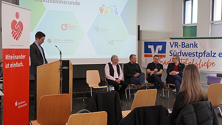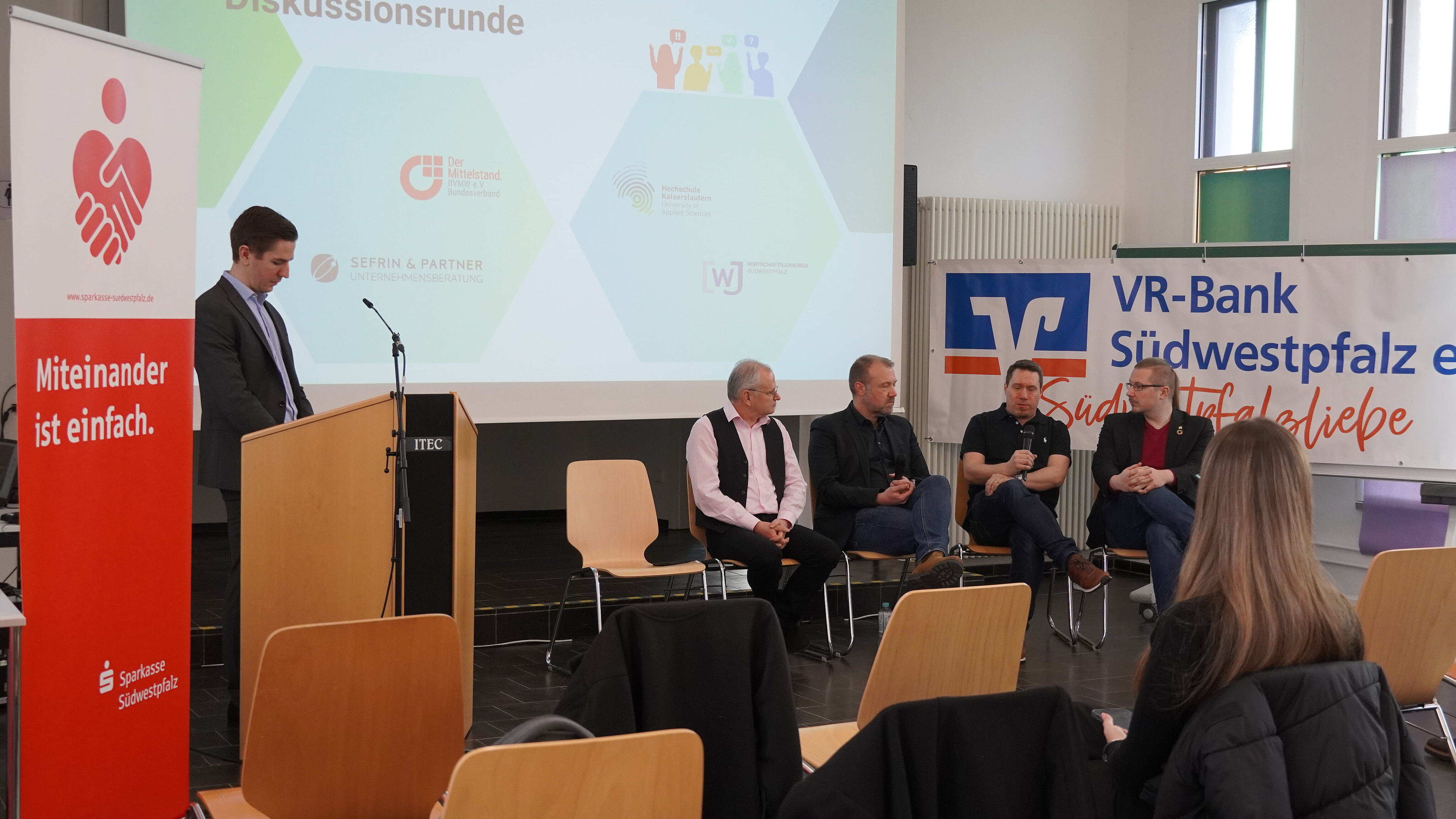 Die anschließende Diskussionsrunde wurde von Student Tim Weber moderiert. Die Diskutanten waren Prof. Dr. Timo Becker von der Hochschule Kaiserslautern, Reinhold Habermann als Repräsentant des BVMW, Matthias Winter als stellvertretender Landesvorsitzender der Wirtschaftsjunioren sowie Karl Geistlich von der Sefrin und Partner Unternehmensberatung. Gemeinsam beleuchteten sie aktuelle Anforderungen und Perspektiven im Mittelstand und unterstrichen die Bedeutung einer engen Zusammenarbeit zwischen Hochschule und regionaler Wirtschaft.