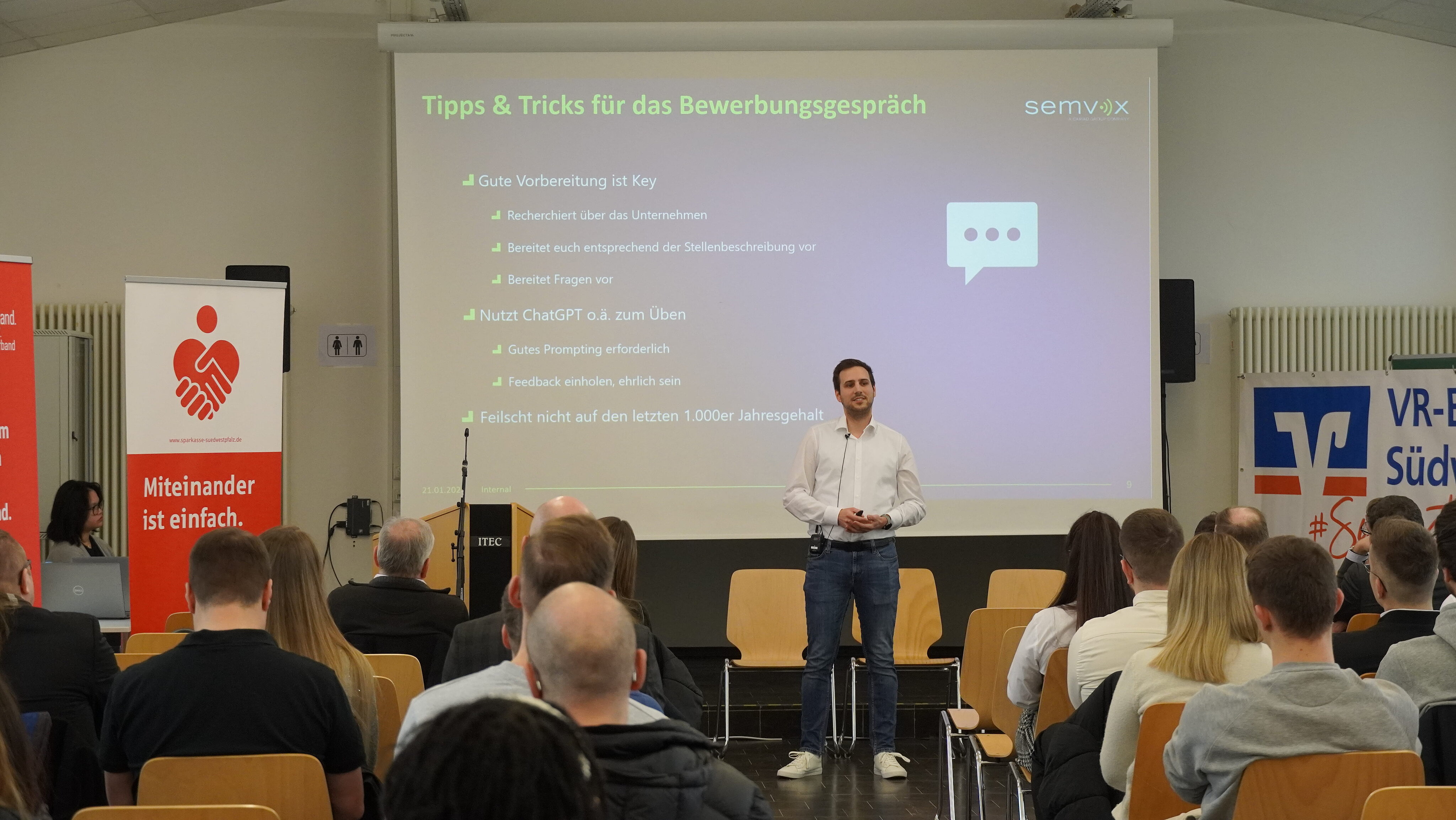 Den ersten Fachvortrag hielt Thomas Hammerschmidt, der an der Hochschule Kaiserslautern zunächst seinen Bachelor im Studiengang Mittelstandsökonomie und anschließend den Masterstudiengang Mittelstandsmanagement absolviert hat. Heute ist er als Sales Manager und Strategic Partnerships bei der Semvox GmbH tätig. In seinem Vortrag berichtete er über seinen persönlichen Werdegang vom Studium in den Beruf und gab den Studierenden praxisnahe Einblicke in seinen Karriereweg. Dabei sprach er offen über Herausforderungen beim Berufseinstieg und betonte insbesondere die Bedeutung von Praxiserfahrung, Eigeninitiative und einer klaren beruflichen Ausrichtung.
