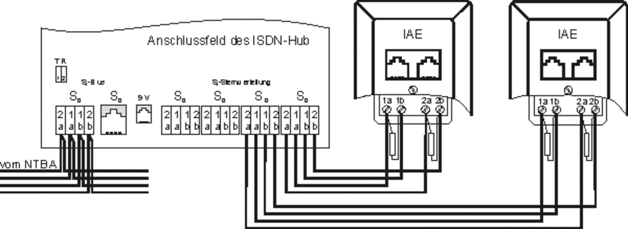 Der ISDN-Hub kann, wie jedes andere ISDN-Gerät, mit einer Geräteanschlussleitung am NTBA oder an einer IAE-Dose angeschlossen werden. Der S0 Bus bleibt dabei voll funktionsfähig. Es ist auch möglich, mehrere ISDN-Hubs am S0 Bus zu betreiben. In Abbildung 10.23 wird eine möglich Installation mit einem ISDN-Hub gezeigt.