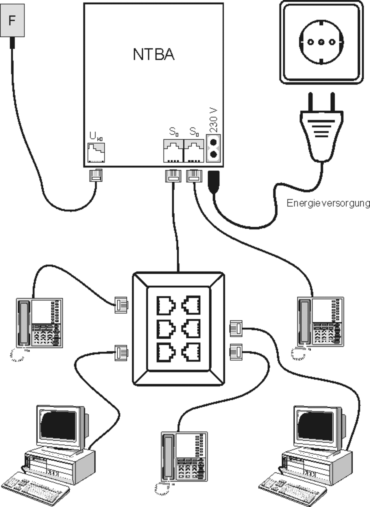 In vielen Fällen wird man mit den beiden S0 Anschlussbuchsen am NTBA auskommen. So könnte man z.B. ein ISDN-Telefon und eine ISDN-PC Karte am NTBA anschließen oder eine ISDN-Telefonanlage und eine ISDN-PC Karte. Bei mehr als zwei Geräten benötigt man weitere S0 Schnittstellen. In diesem Kapitel wird gezeigt, wie diese installiert werden.