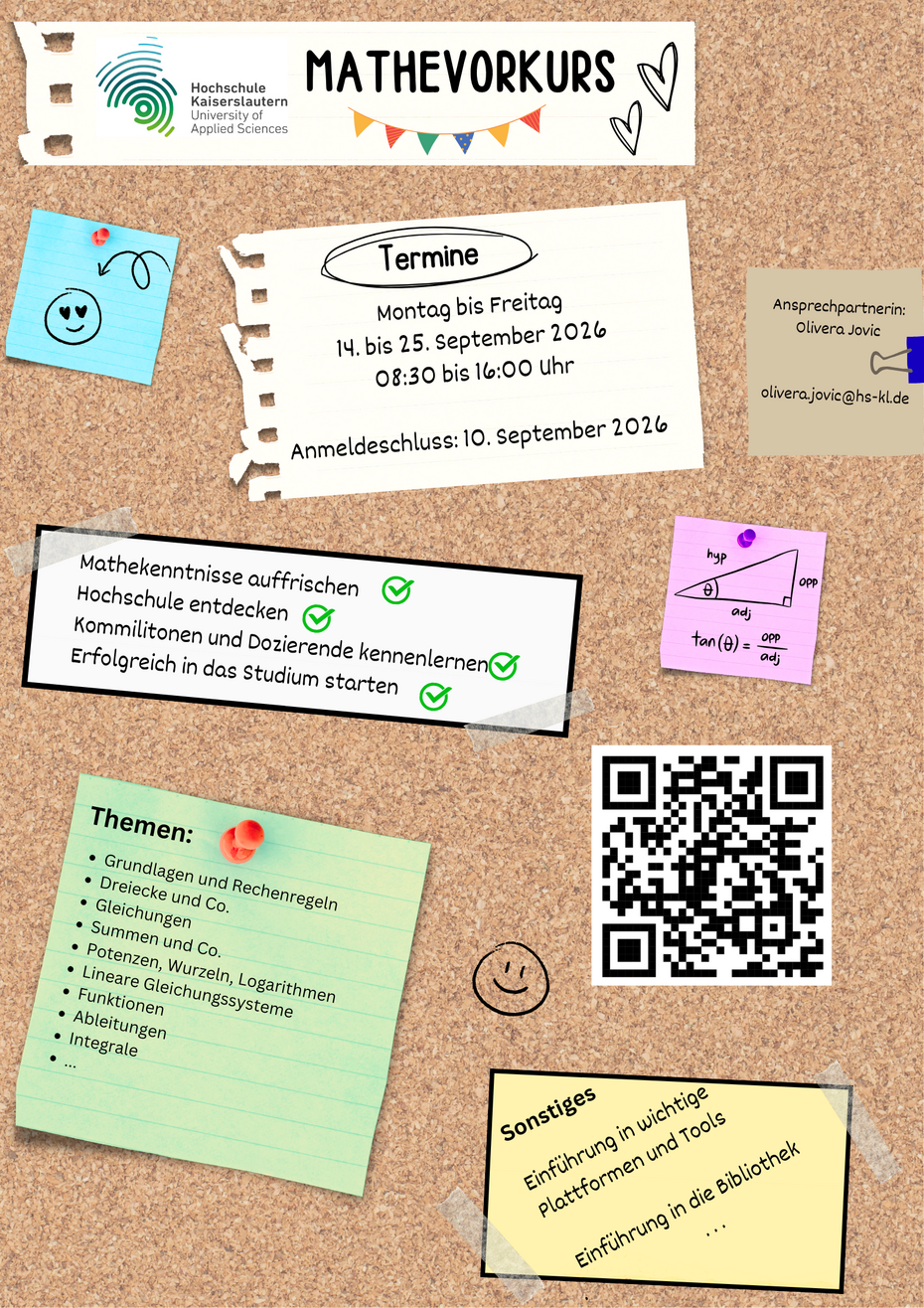 Wir freuen uns, den Mathevorkurs für Studienanfänger im Fachbereich AING und BG ankündigen zu können. Der Kurs wird vom 14. bis 25. September 2026 ganztägig am Campus Kaiserslautern stattfinden. Der Anmeldeschluss ist der 10. September. Wir freuen uns auf Ihre Teilnahme!